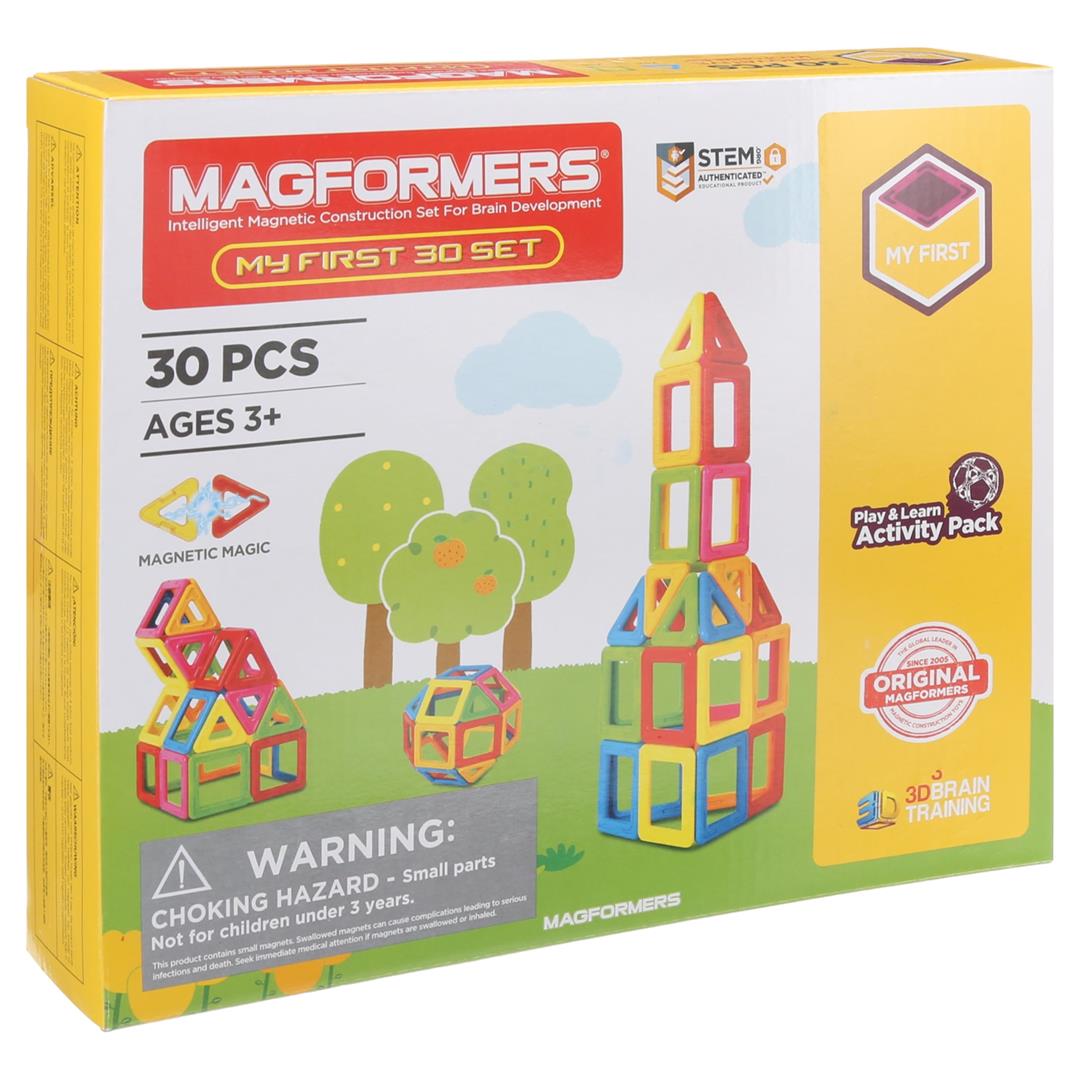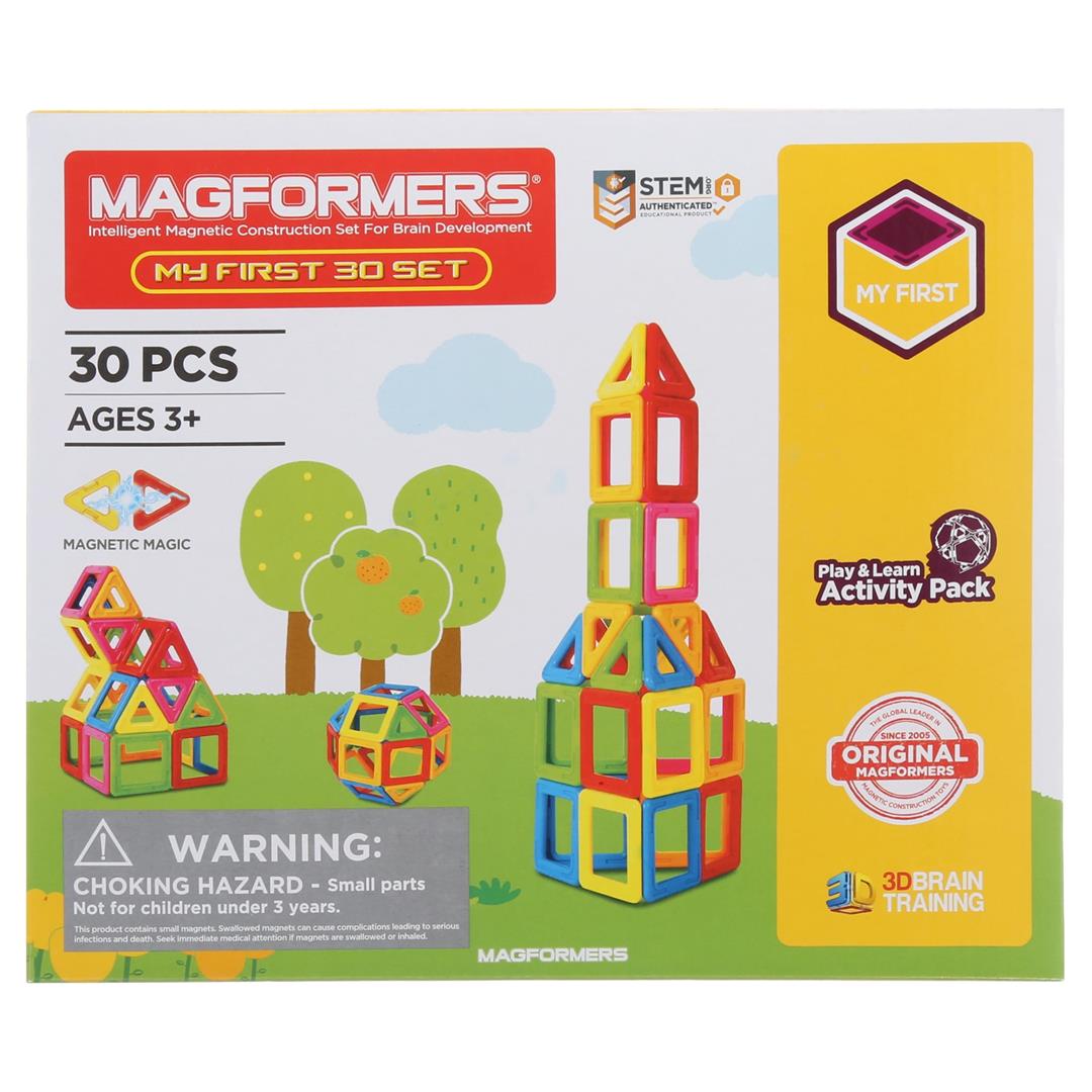 The original and authentic Magformers. 30 magnetic geometric shapes. 18 squares, and 12 triangles and hard back idea booklet. STEM Accredited by STEM.org. Perfect for brain development, critical thinking and education. Step-by-step educational idea booklet with follow along ideas and instructions. Neodymium rare-earth magnets for guaranteed connectivity. Compatible with all Magformers shapes and accessories. Super strong, safe and durable BPA-free High Quality ABS plastic. Conforms to CE, ASTM and EN71 Ages 3 years and up.